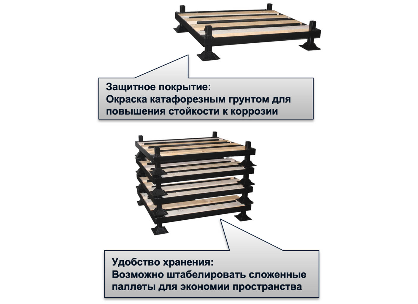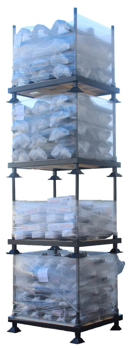 ✓ Ограничение перемещений верхних паллет относительно нижних при штабелировании и в процессе перевозки за счёт применения направляющих опор.